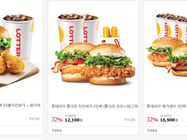 [11번가] 롯데리아 1~3인팩 최대 32% 할인 (2/3~9)