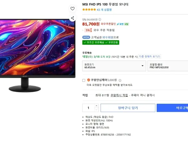 [쿠팡]MSI IPS 100Hz 24인치 무결점 모니터 (81,700원/무료)