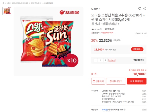 [롯데온] 스윙칩 60g 10개 + 썬 80g 10개 (18,900원 / 무배)